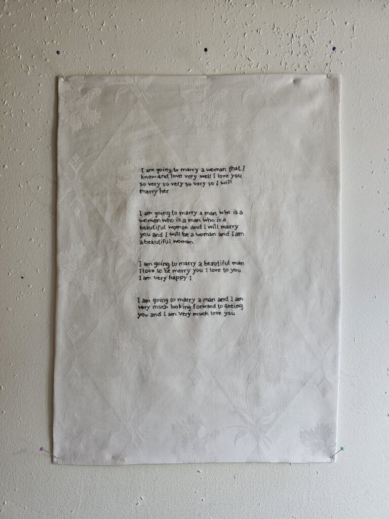 Antonia Oster, I am going to marry, 2025, Besticktes Bettlaken Baumwolle, 37 x 52 cm