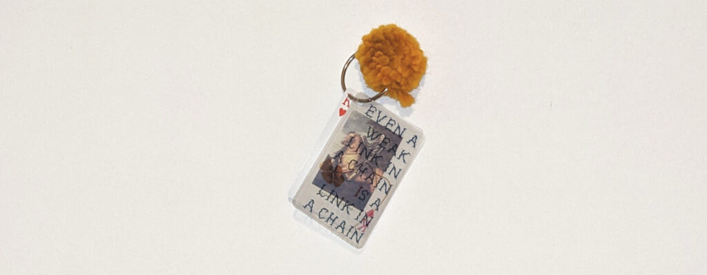 playing card, metal key ring, fabric ball, 9 x 6 x 5 cm